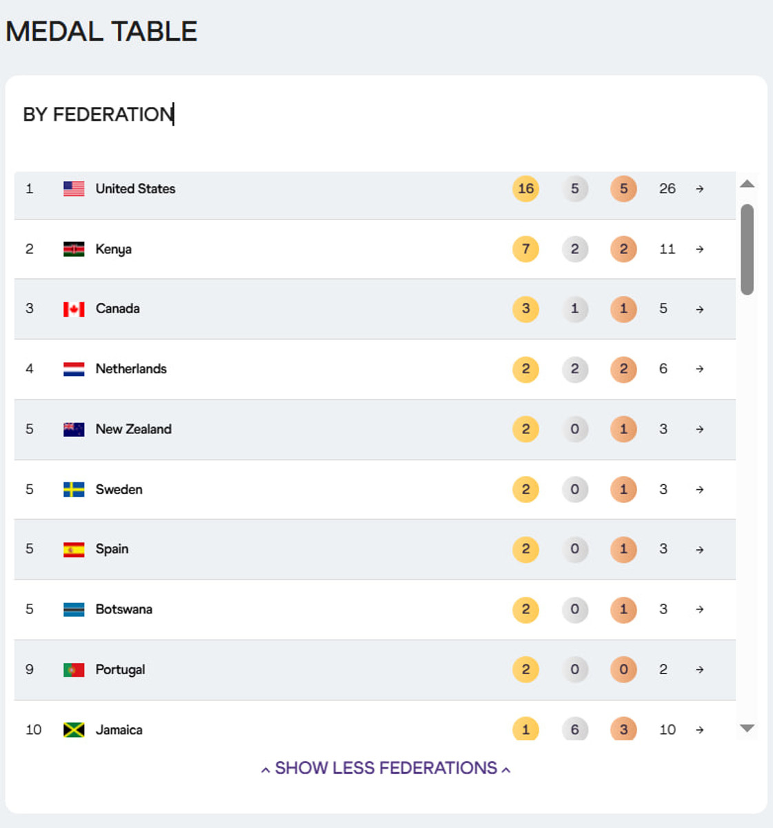 Надо отметить и результат сборной Ямайки. Представители этой страны в целом завоевали аж 10 наград, но лишь однажды удалось стать первыми. Поэтому они заняли 10 место, пропустив вперед Португалию, у которой всего 2 награды, но обе золотые.
