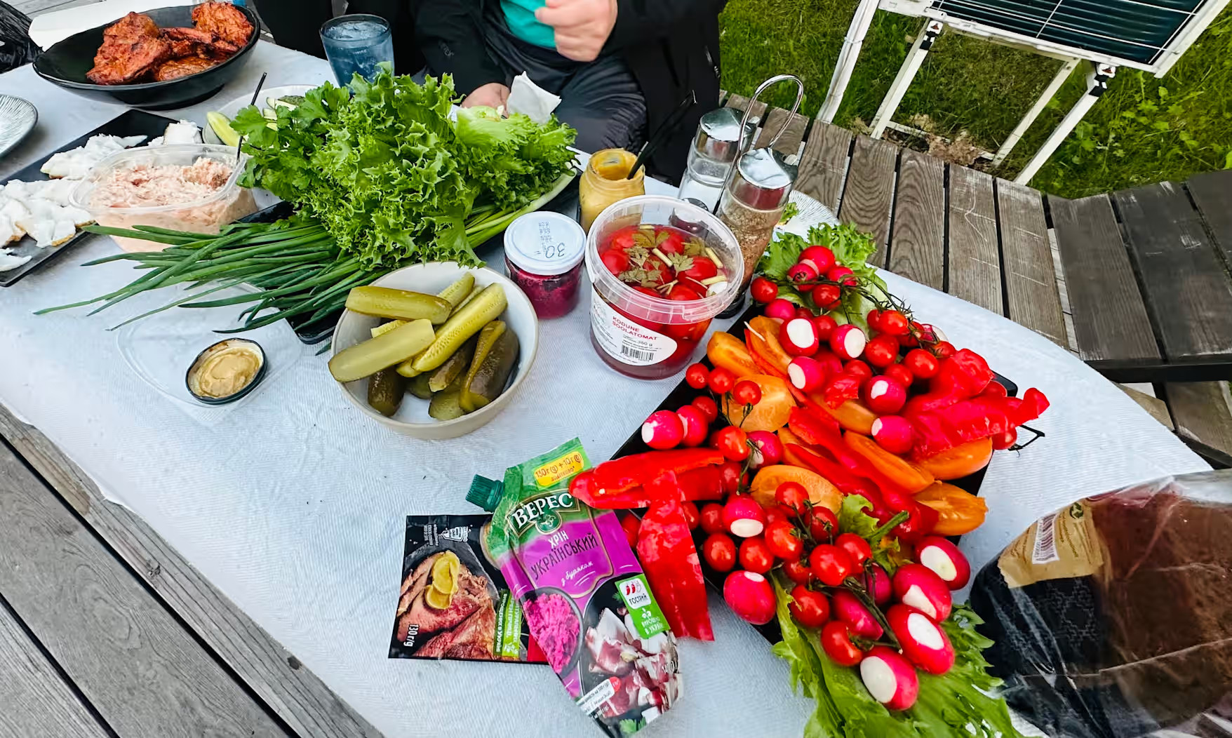Среди блюд – черный украинский хлеб, редиска, соленое сало, хрен, а также сочные стейки, только что с гриля.