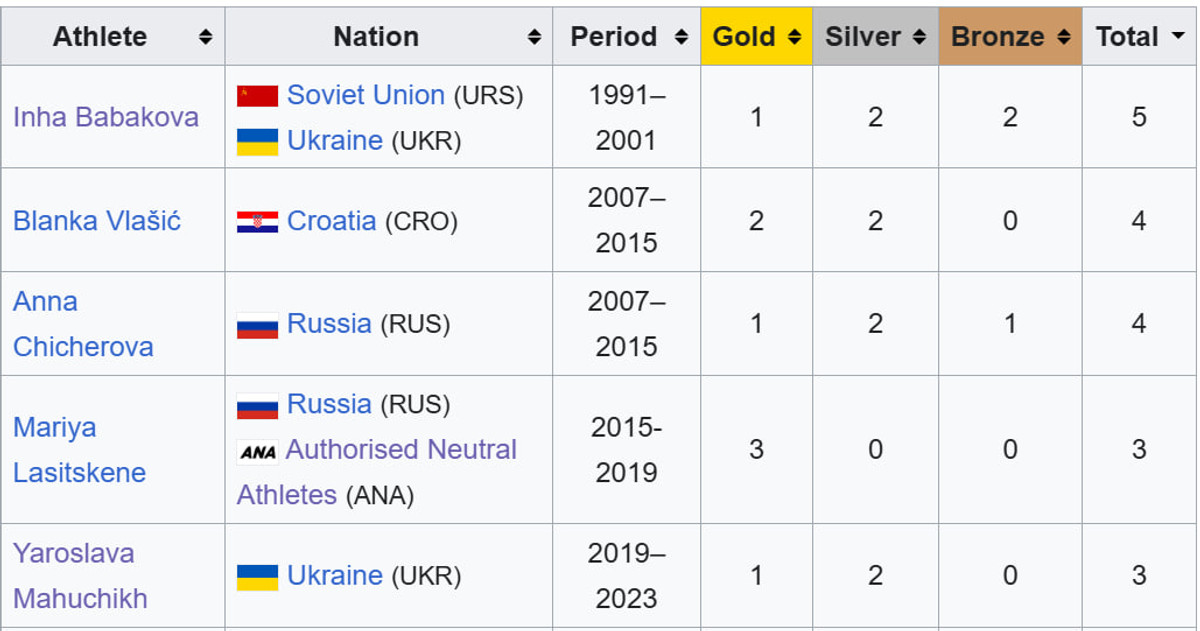 Бланка Влашич дважды (2007 и 2009) становилась чемпионкой, а также дважды (2011 и 2015) занимала второе место.