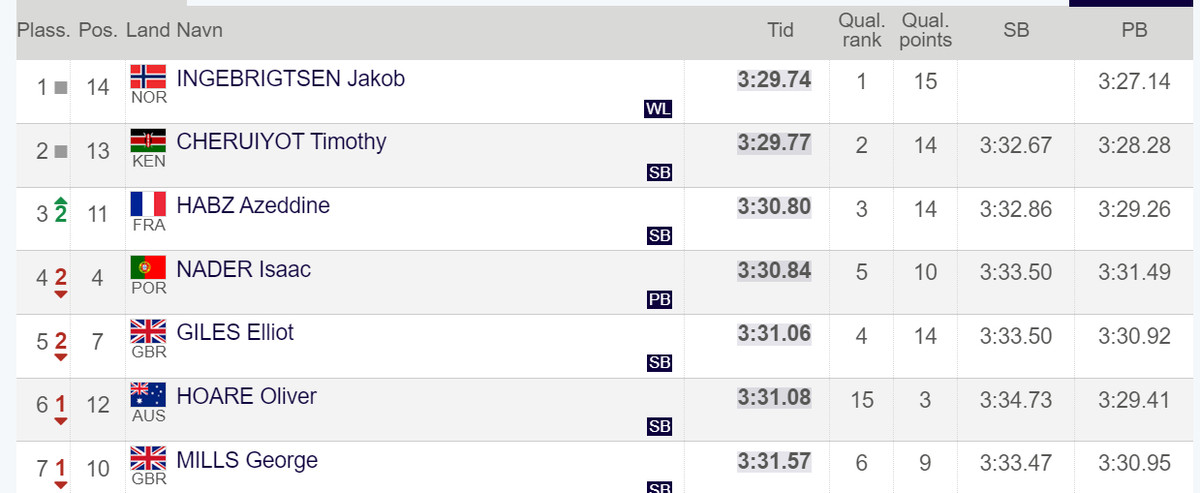 Норвежец преодолел дистанцию 1500 метров в 3:29.74 и лишь на три сотых опередил кенийца Тимоти Черуйота (3:29.77). Победу Якоб одержал благодаря прыжку перед финишной линией.