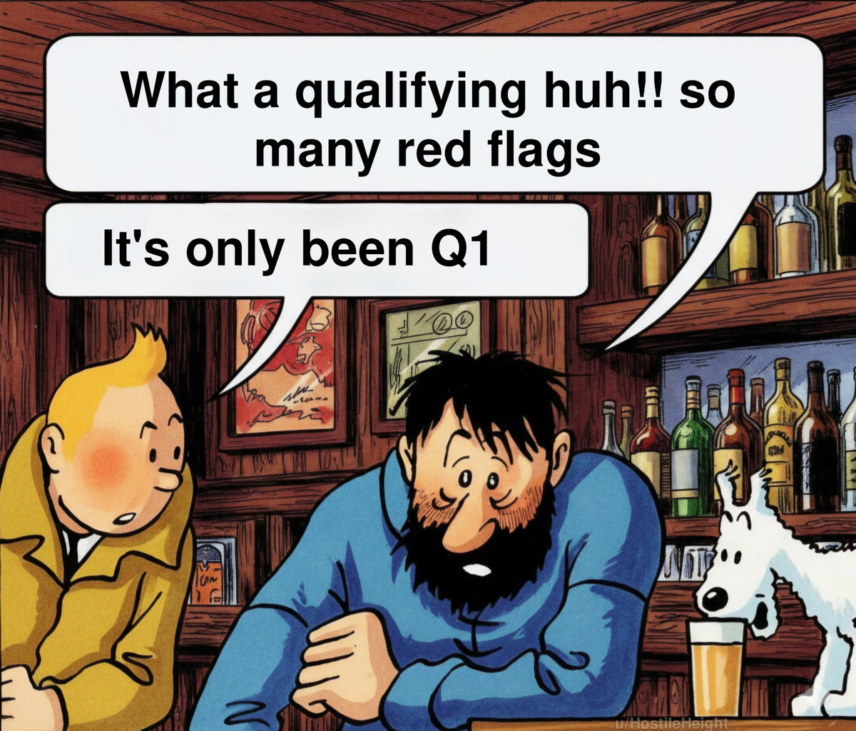 Действительно, то, что началось в первом сегменте, задало тон всей сессии. Сначала Алекс Албон ошибся при входе в первый поворот, что привело к поломке передней подвески и красным флагам. Сессия возобновилась, и эстафету Албона подхватил Нико Хюлькенберг, к ним присоединился Франко Колапинто.
