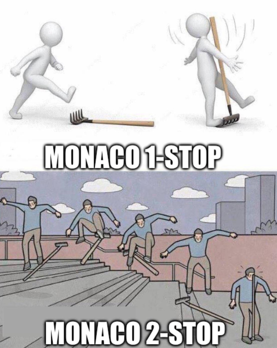 В этот раз не сыграл ни один из исходов. Квали монегаск проиграл, на старте Норрис хоть и заблокировал колеса, но в стену не улетел и лидерство сумел удержать, а стратегия у всех, по сути, была одна.