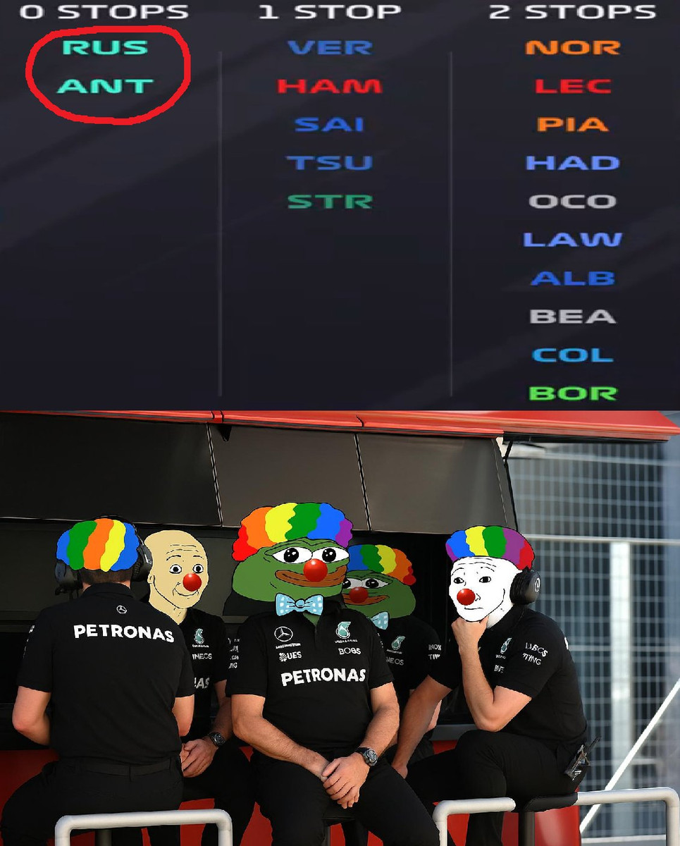 В какой-то момент гонки пилоты Мерседес были единственными, кто не ездил даже на первый обязательный пит-стоп, чего уж говорить о втором. Итог был предсказуем: Антонелли финишировал последним, а Расселл... Там отдельная история.