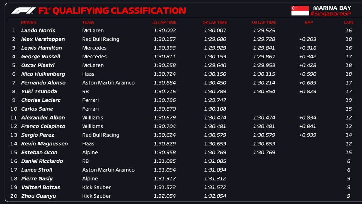 Пилот Макларена Ландо Норрис выиграл квалификацию в Гран-при Сингапура-2024 Формулы-1.