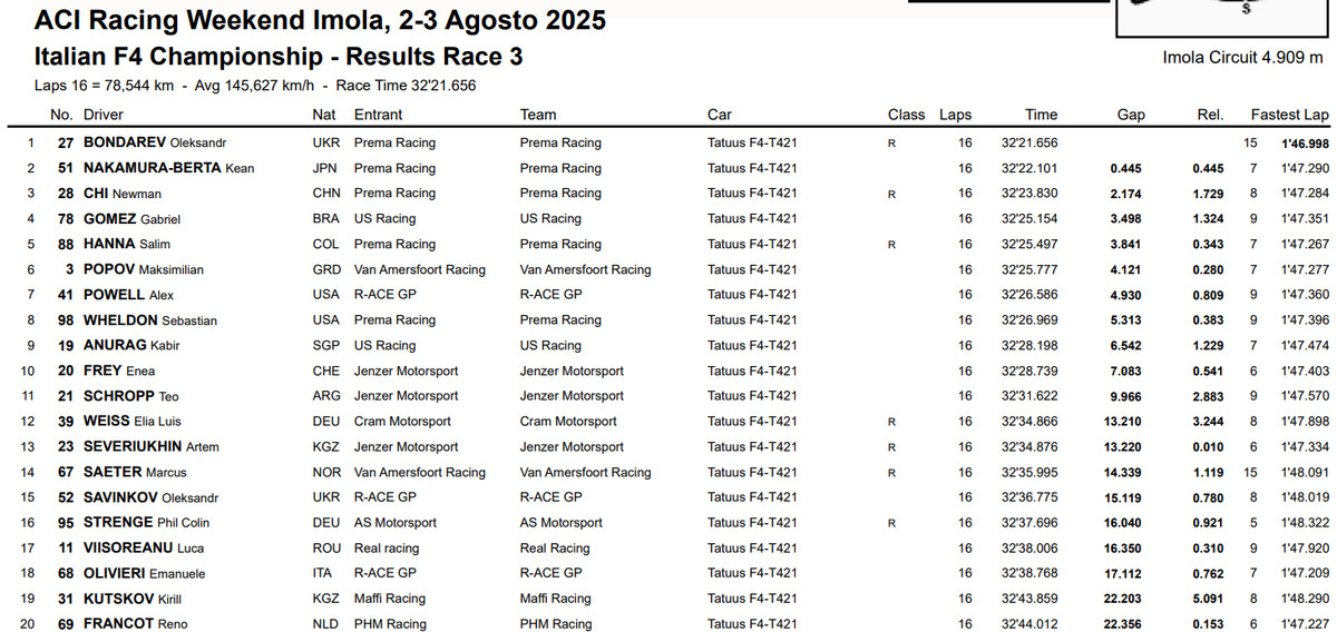 Сегодня, 3 августа, в рамках пятого этапа итальянской Формулы-4, который проходит в Имоле, состоялась третья гонка. Этот заезд завершился победой пилота команды Prema Racing Александра Бондарева.