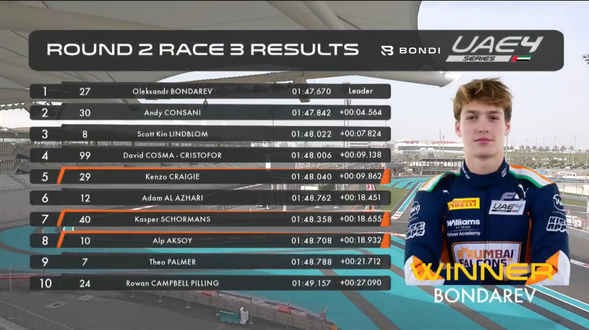 Напомним, что UAE4 является несертифицированной FIA серией гонок, которая стала преемницей чемпионата Среднего Востока Формулы-4. По итогам второго этапа Бондарев лидирует в личном зачете пилотов с отрывом в 16 очков.