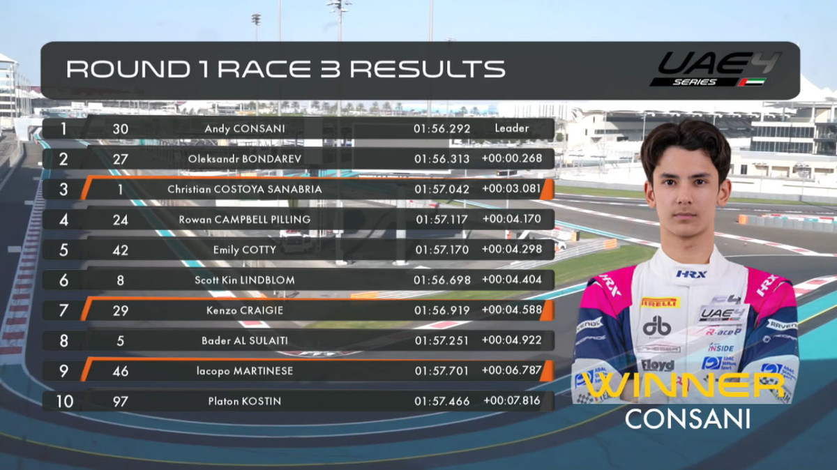 Украинский пилот Prema Racing Александр Бондарев занял вторую позиции в третьей гонке первого этапа Формулы-4 UAE4 (Ближний восток) Series в Абу-Даби.