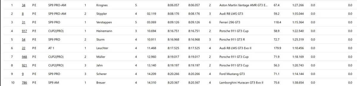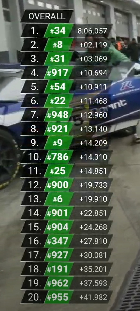 Макс на три секунды был медленнее победителя квалификации на Астон Мартин Vantage AMR (8:06,057) и почти на одну секунду медленнее Ауди R8, который стал вторым (8:08,176).