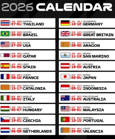 Как и в 2025 году, сезон будет состоять из 22 этапов и начнется с Гран-при Таиланда в Бурираме. Второй этап состоится в Гоянии (Бразилия), вместо Аргентины, а завершится сезон в Валенсии, Испания.