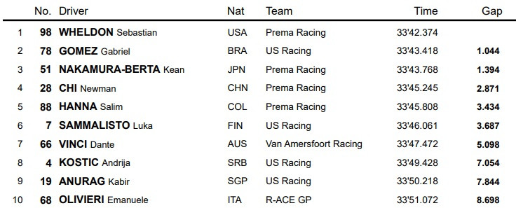 Победу одержал другой гонщик Prema Racing, Себастьян Уэлдон, который опередил Габраэла Гомеса и Кина Накамуру-Берту.
