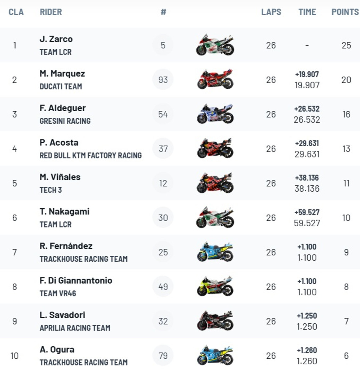 Трасса высыхала недостаточно быстро, и Зарко на шинах для дождливой погоды сумел удержать лидерство, опередив на 19 секунд Марка Маркеса, который финишировал вторым. Топ-3 замкнул новичок чемпионата Фермин Альдегер.