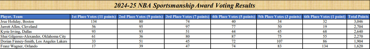 Холидей получил от коллег 134 первых места, что с большим отрывом стало лучшим результатом. В общей сложности Джру заработал 3 046 очков. На втором месте расположился центровой Кливленд Кавальерс Джарретт Аллен (2 704), а на третьем – звезда Даллас Маверикс Кайри Ирвинг (2 640).