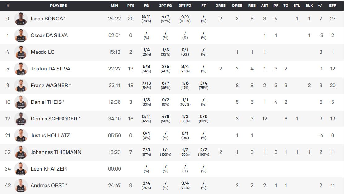 В игре немцев держали Франц Вагнер и Айзек Бонга, а затем вспомнил свои навыки и Шредер. Перед решающей четвертью разница была минимальная - 67:66 в пользу Турции.