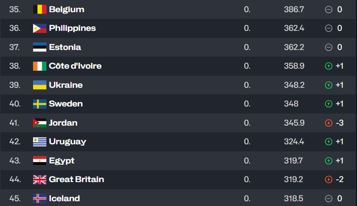 Позиции соперников Украины по квалификации на ЧМ-2027 не претерпели изменений: Испания занимает 7-е место, Грузия – 20-е, а Дания расположилась на 58-й строчке.