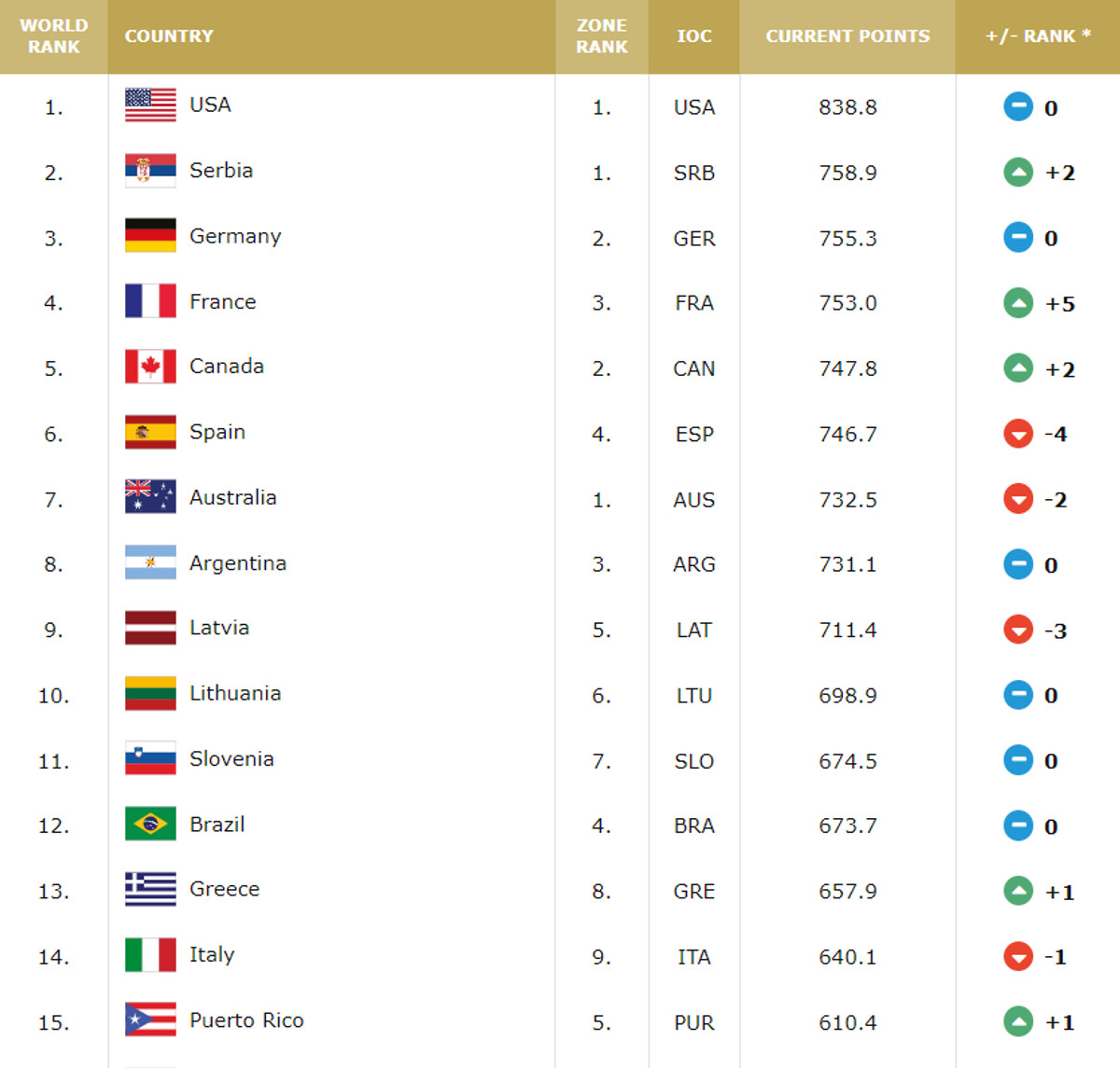 В нем произошли некоторые изменения. Сборная Сербии благодаря третьему месту на Олимпиаде поднялась на две позиции и теперь занимает второе место.
