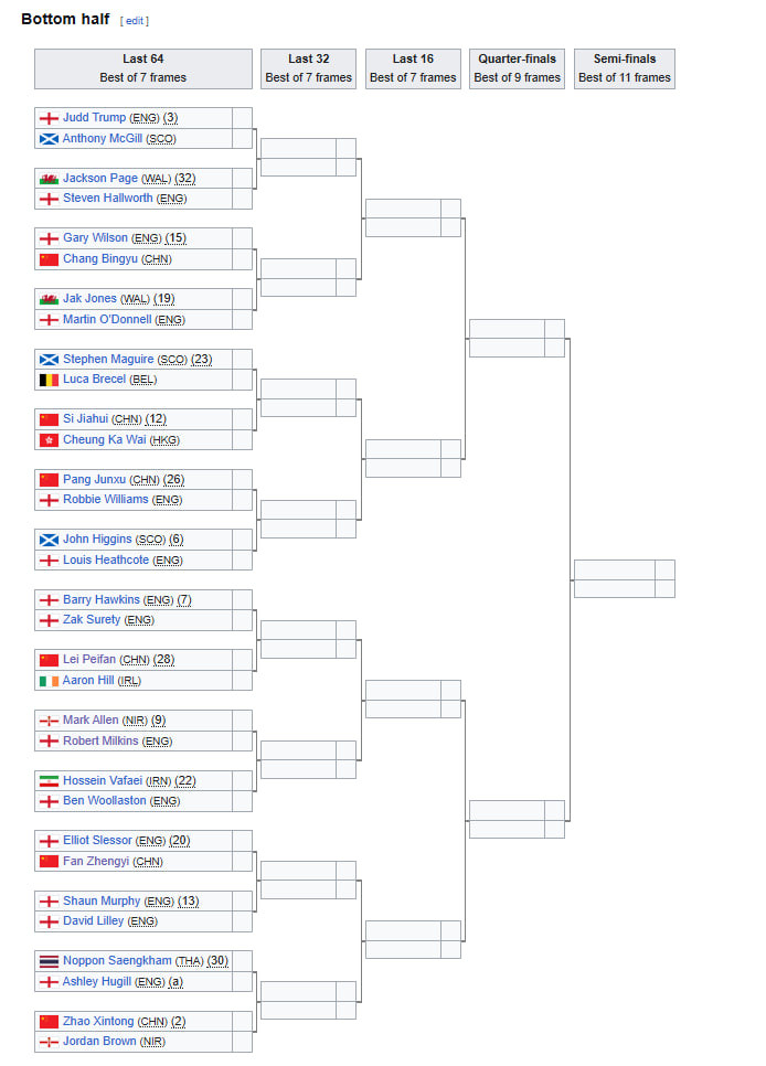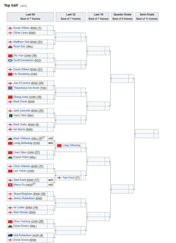 В верхней части сетки свой путь в турнире начнет действующий чемпион Кайрен Уилсон, который сыграет против Оливера Лайнса. Этот матч имеет забавную предысторию: