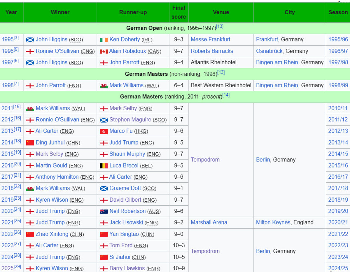 За свою современную историю German Masters видел немало чемпионов мирового уровня. Одним из самых успешных в новейшую эпоху является Джадд Трамп, который выигрывал турнир несколько раз и доминировал в берлинском Tempodrom, установив рекорд по количеству титулов до 2025 года.