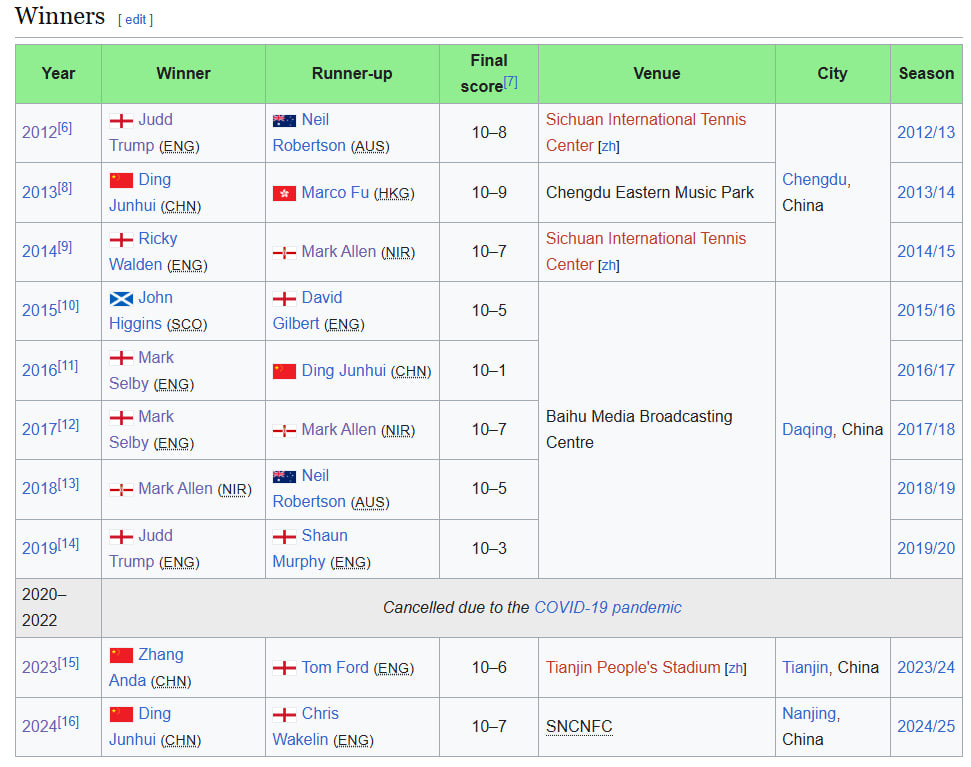 Китайские игроки традиционно чувствуют себя здесь как дома, хоть и менялись города проведения. Дин Джуньху – двукратный чемпион и еще раз был финалистом (2016). Правда, тогдашний решающий матч с Марком Селби стал самым односторонним в истории турнира – Джуньху взял лишь один фрейм.