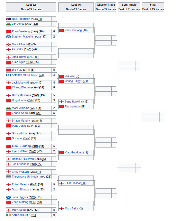 Чжоу Юэлун, У Ицзе, Чжан Анда, Чжан Биньюй и Сяо Годун получили путевки в 1/8 финала.