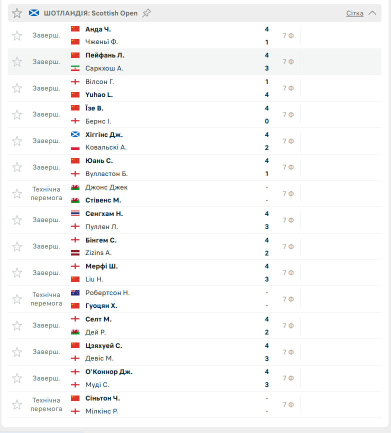 Главная сенсация произошла в матче между Гэри Уилсоном и Лань Юйхао. 40-летний англичанин, который становился победителем Scottish Open в 2022 и 2023 годах, проиграл игру 17-летнему сопернику со счетом 1:4.