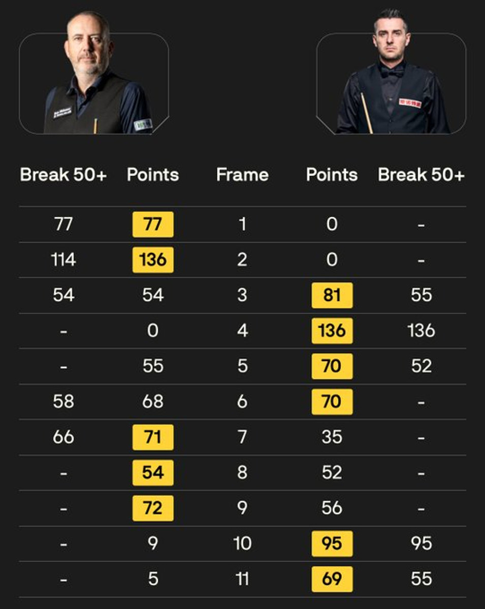 Селби ответил двумя полусотнями и великолепным брейком в 136 очков, отыграв следующие четыре фрейма и поведя в счете 4:2. Следующие три партии забрал Уильямс.