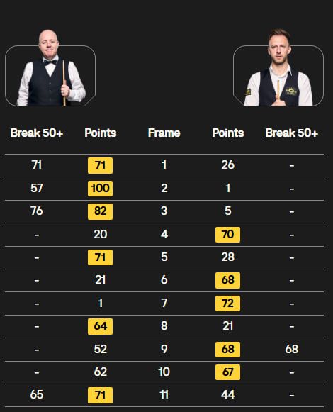 В первой игре сошлись Джадд Трамп и Джон Хиггинс. Фаворитом был №1 мирового рейтинга, но 50-летний шотландец начал доказывать, что еще имеет порох в пороховницах.
