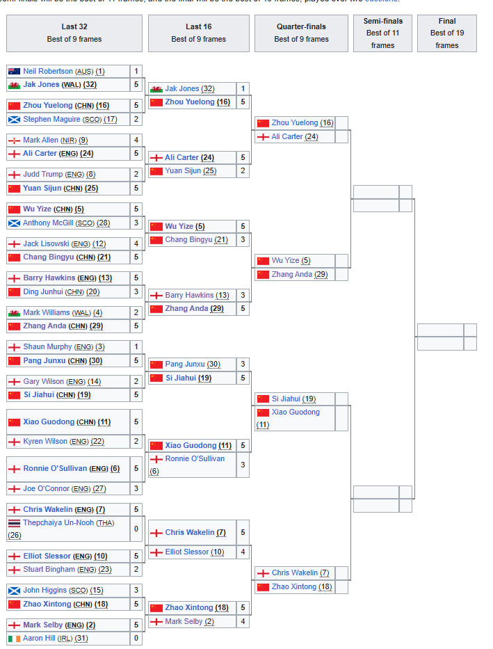 Честь англичан отстоял Али Картер. Он проигрывал Юаню Сицьзюню 0:2, но потом на опыте и кураже забрал следующие 5 фреймов.