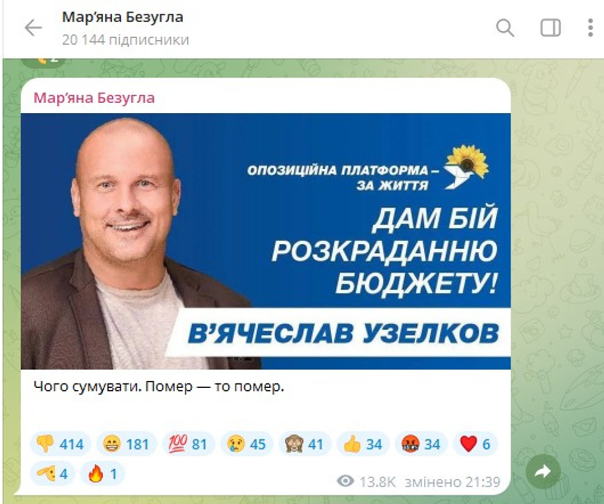 В своем Telegram-канале 36-летняя Безуглая разместила кадр с предвыборной агитации Узелкова в 2020 году на выборах в Виннице. Тогда Вячеслав баллотировался в мэры от "Оппозиционной платформы – За жизнь".