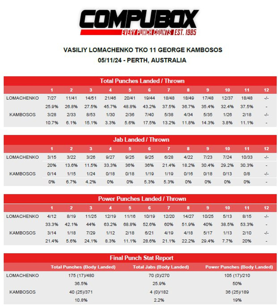 В общей сложности Ломаченко нанес 480 ударов (36,5% из которых были точными), против 371 удара (10,8%) у Джорджа.