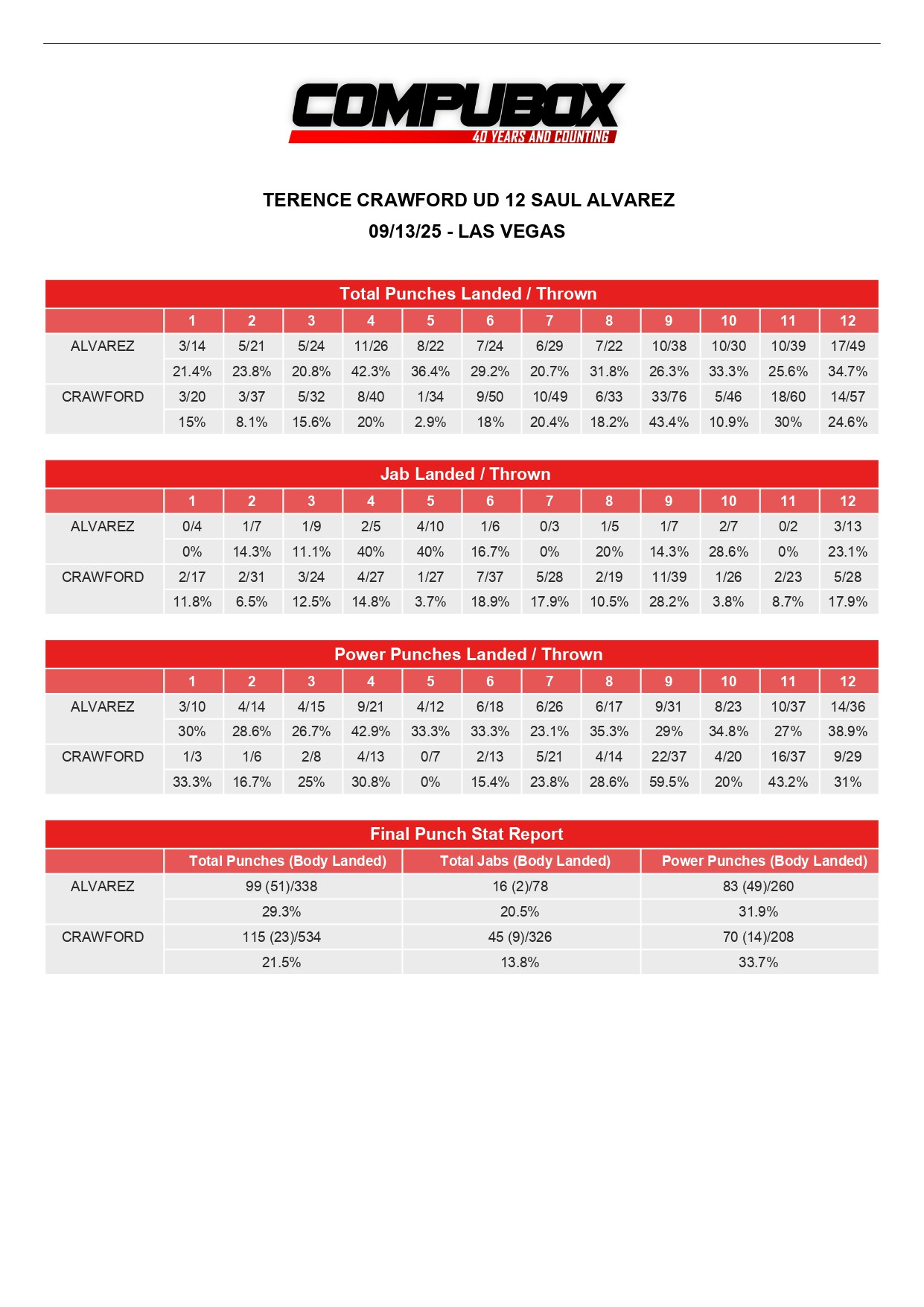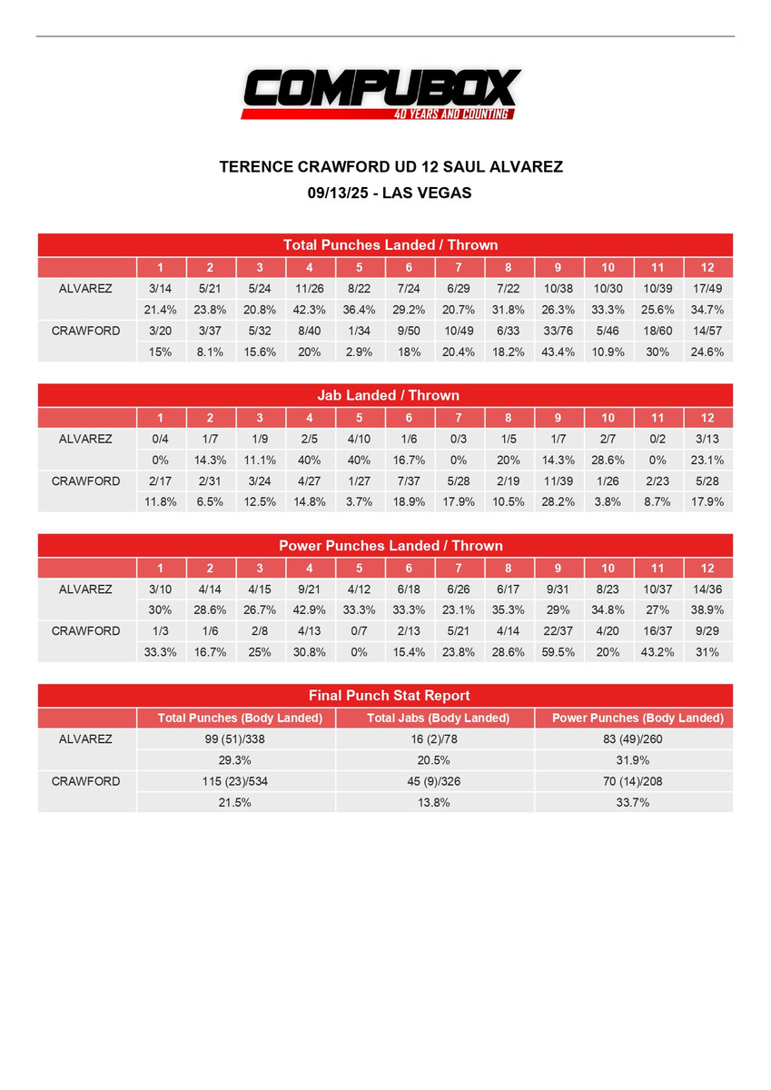 Согласно итоговой статистике ударов по данным Compubox, Кроуфорд бил значительно чаще (534-338) и соответственно попадал тоже чаще (115-99).
