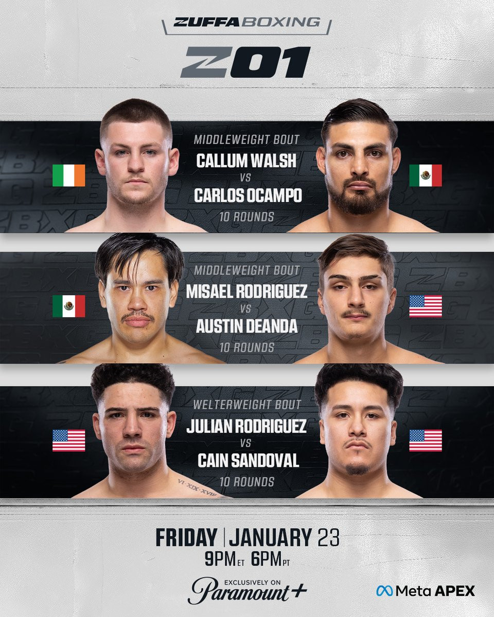 Вечер бокса состоится 24 января в Лас-Вегасе (США), который возглавит поединок в первом среднем весе между ирландцем Каллумом Уолшем (15-0, 11 КО) и мексиканцем Карлосом Окампо (38-3, 26 КО).