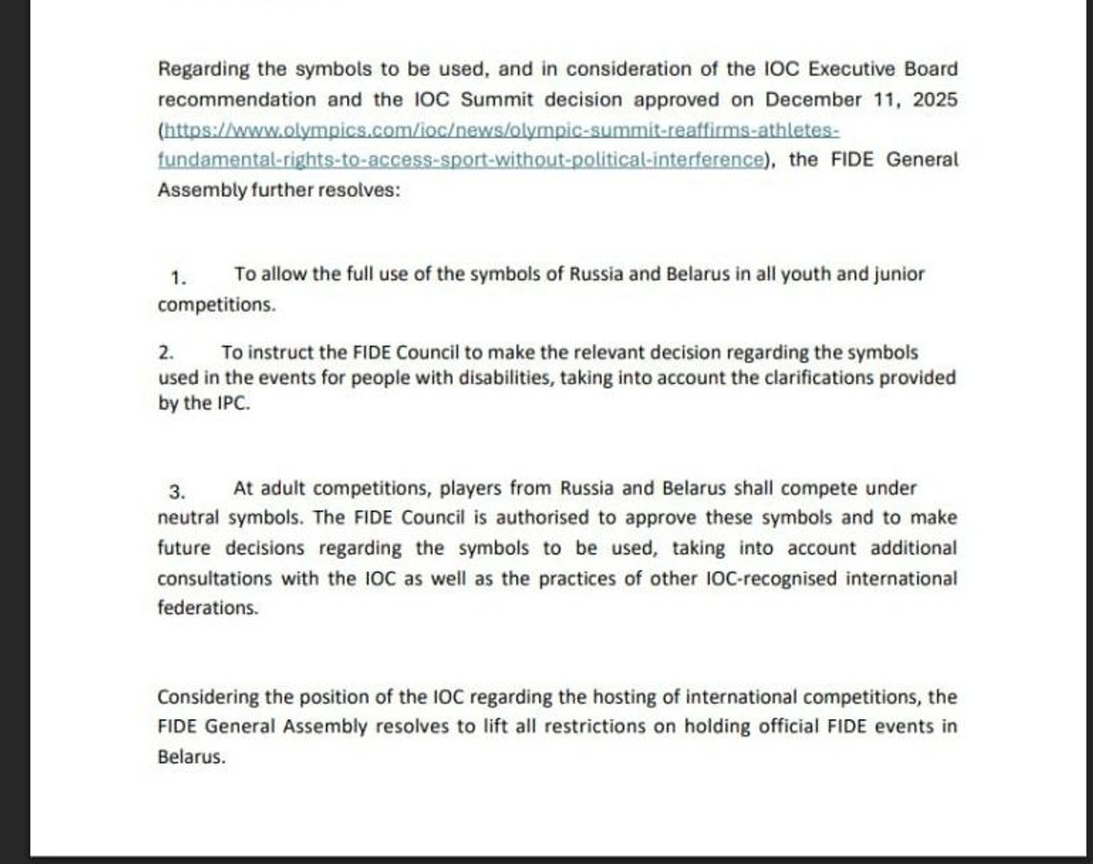 Вместе с этим международная организация допустила россиян и белорусов к командным соревнованиям, а также позволила проводить турниры в Беларуси под эгидой ФИДЕ.