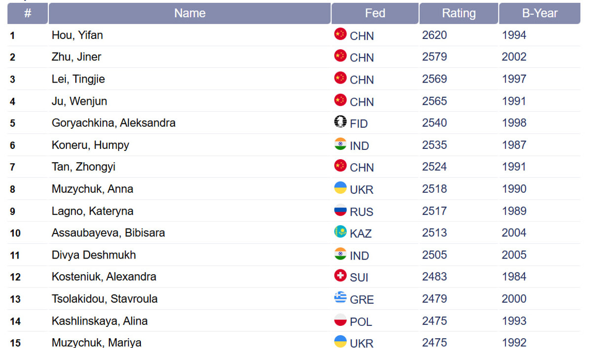 В список лучших шахматисток мира также входят Юлия Осьмак (№23, 2452) и Анна Ушенина (№31, 2423).