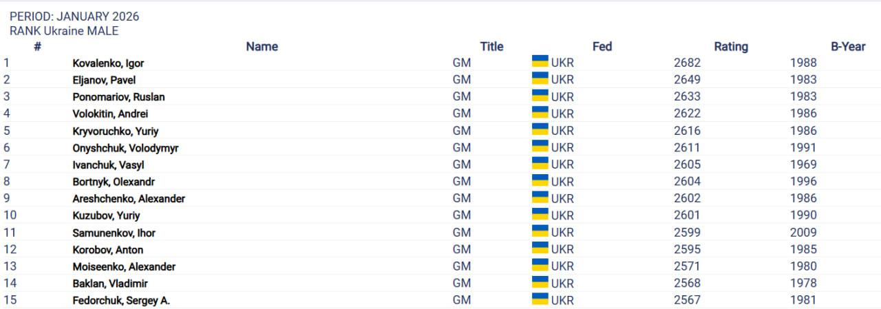 Рейтинг украинских шахматистов по состоянию на январь 2026-го: