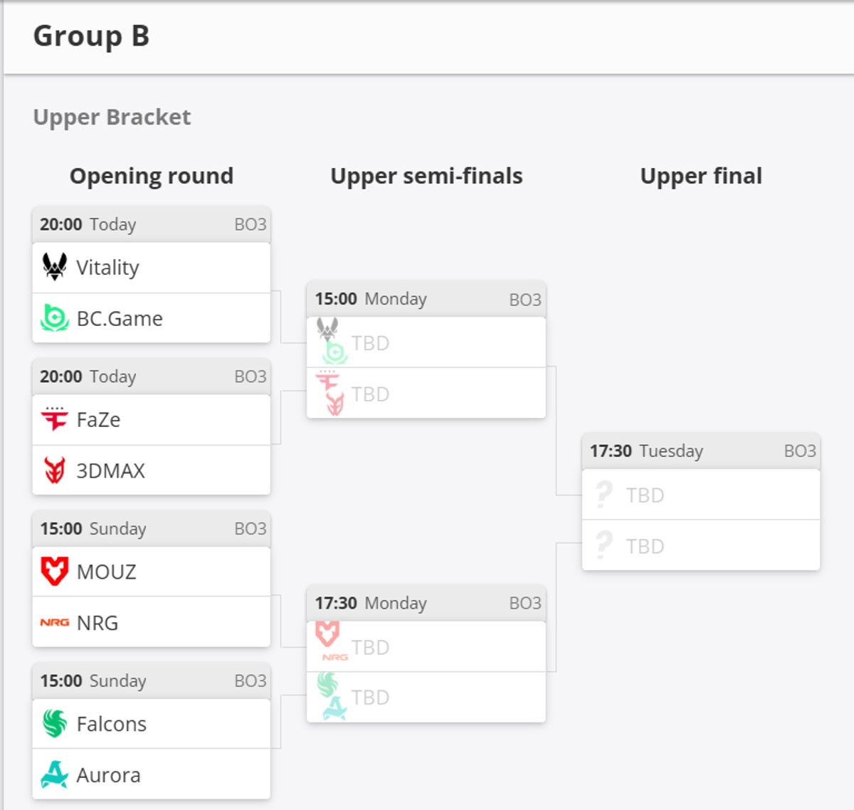 Кроме этого, путевку в основной этап завоевали Astralis (Дания), Aurora (-) NRG (США), 3DMAX (Франция), G2 (Германия) и PARIVISION (-). Они присоединятся к остальным 8 лучшим командам, получившим приглашение напрямую во вторую стадию.