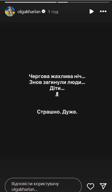 "Очередная ужасная ночь... Снова погибли люди, дети. Страшно. Очень", – написала Харлан.