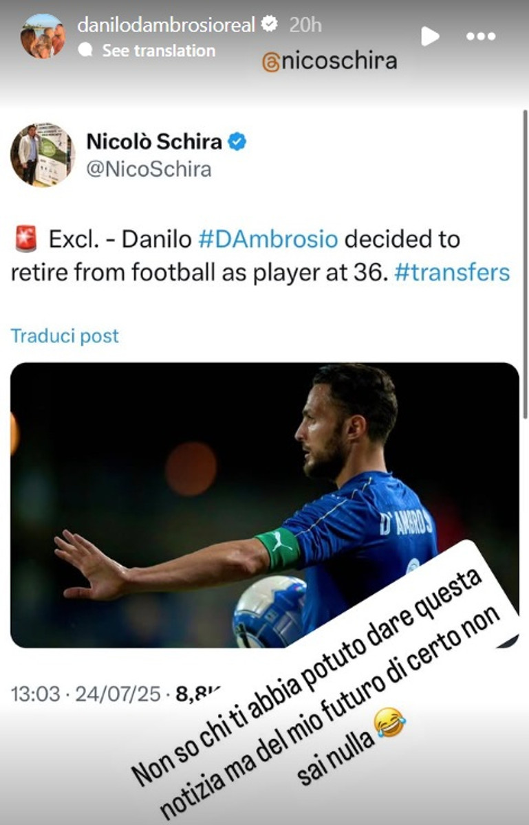 Известный итальянский защитник Данило д'Амброзио высмеял известного инсайдера Николо Скиру из-за информации о якобы решении футболиста завершить карьеру.