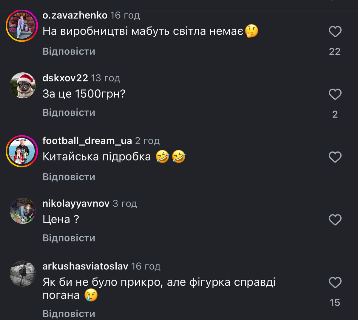 Фанаты обратили внимание, что фигурка практически не похожа на защитника сборной Украины. По их словам, изделие выглядит дешево, имеет слабую детализацию, неровную покраску и в целом производит впечатление некачественного сувенира.