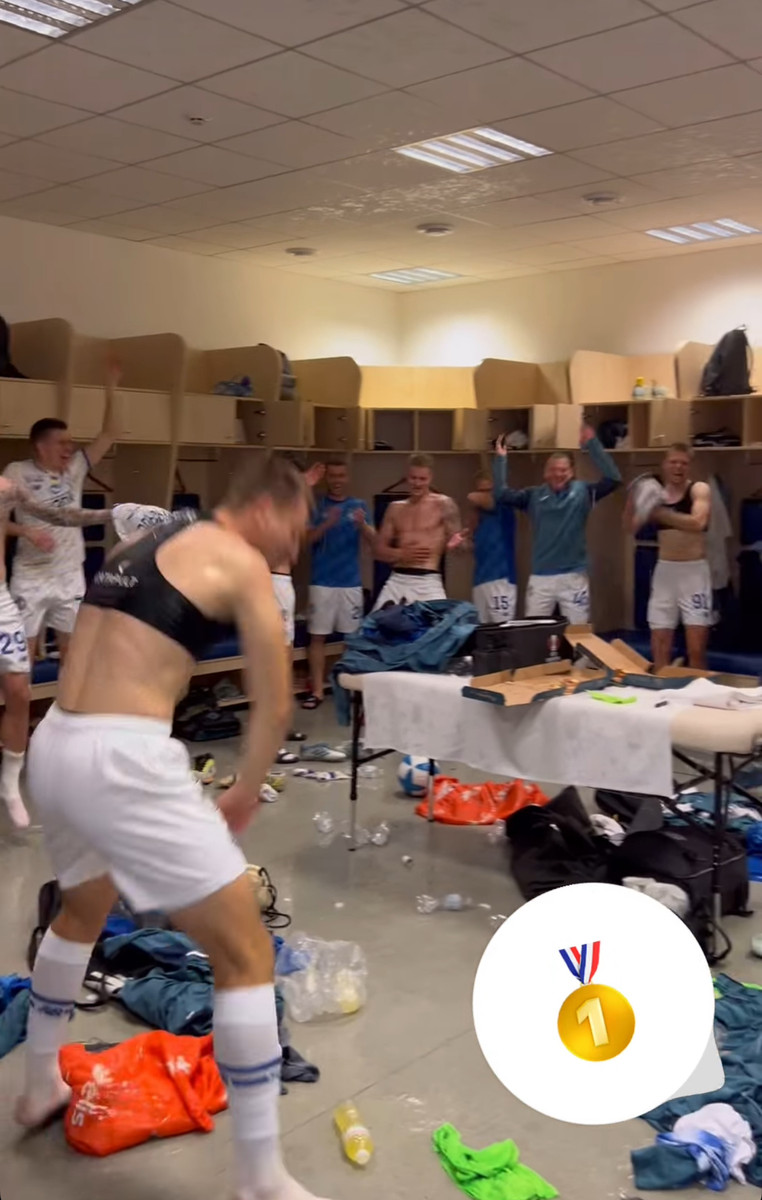 Команда пела любимые песни, обливалась и танцевала, превратив раздевалку в настоящую праздничную арену.