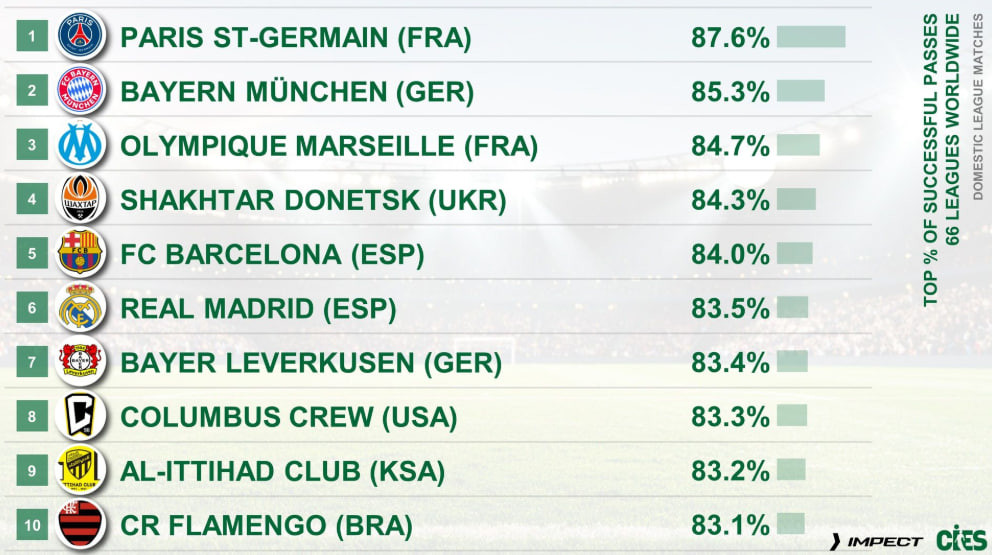 Донецкий Шахтер занял четвертое место в глобальном рейтинге по эффективности паса, опередив ведущие испанские клубы. По статистическим данным, точность передач команды в текущем сезоне национального чемпионата составляет 84,3%.