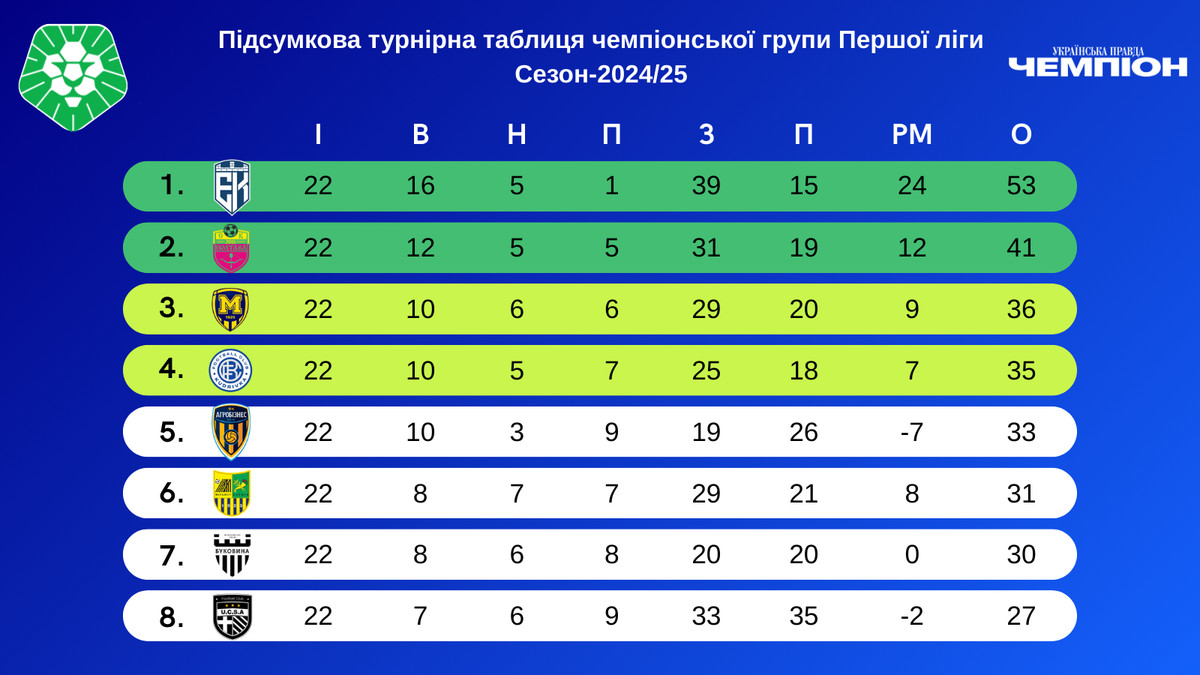 Вот и завершился сезон-2024/25 Первой лиги Украины в группе "Чемпионская", где восемь лучших команд Профессиональной футбольной лиги соревновались за выход в Украинскую Премьер-лигу.
