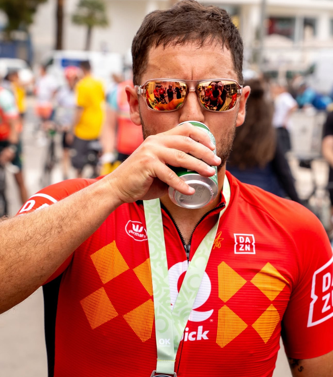 Завершив дистанцию, Азар не скрывал эмоций и решил восстановить силы по-своему – банкой холодного пива.