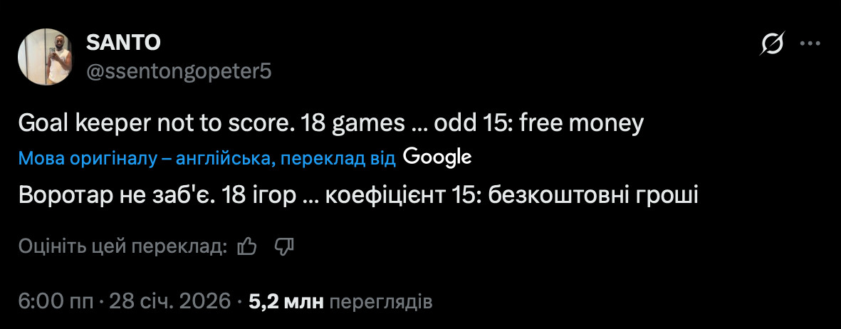 В соцсети X (Twitter) настоящим вирусным хитом стал прогноз пользователя под ником SANTO, который накануне матчей Лиги чемпионов уверенно советовал всем ставить на то, что в 18 поединках турнира ни один вратарь не забьет гол.