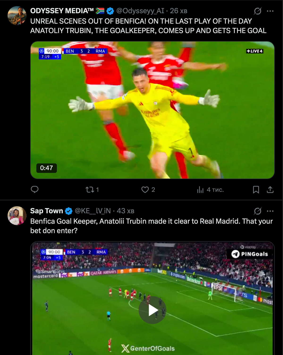 Однако уже через несколько часов все пошло совсем не по плану – украинский голкипер Бенфики Анатолий Трубин сенсационно забил головой мадридскому Реалу на 90+8 минуте, принеся своей команде победу 4:2 и выход в плей-оф Лиги чемпионов.
