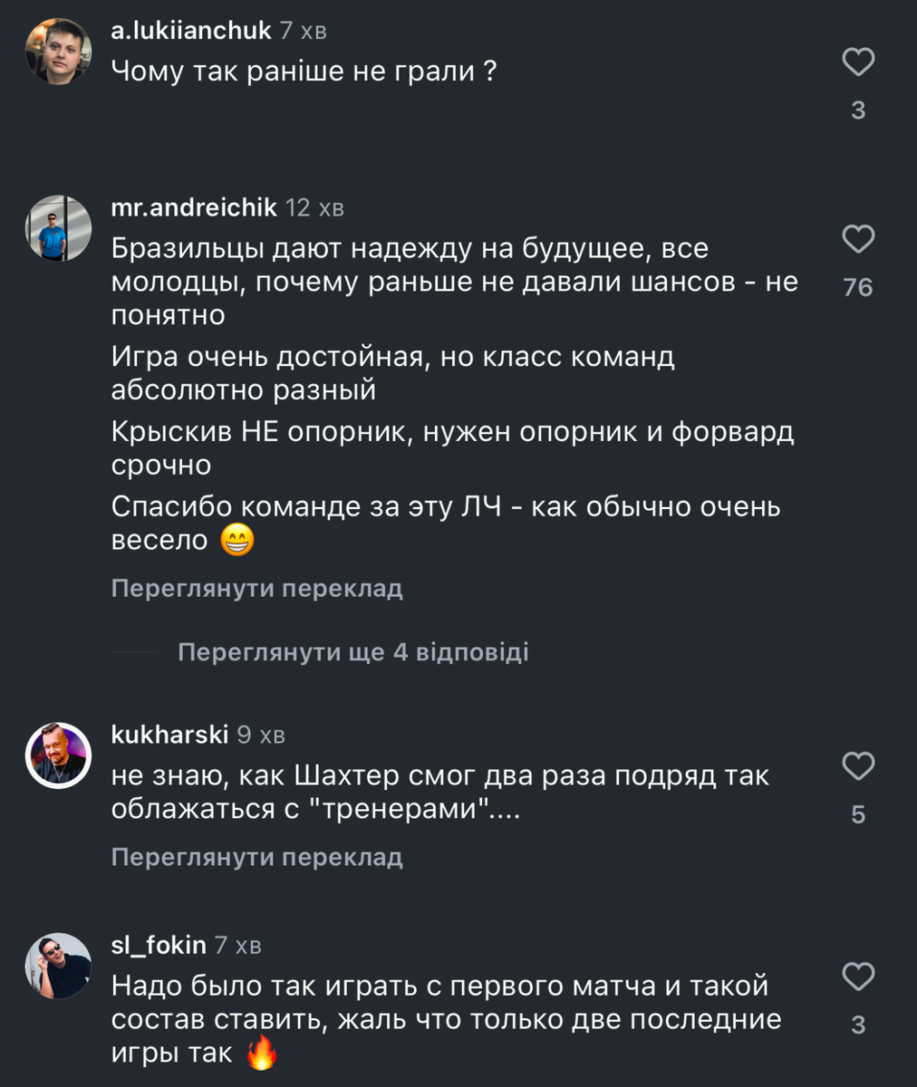 Болельщики также отметили улучшение химии на поле, остроту атак, сейвы Ризныка и многие другие моменты. Пользователи в соцсетях просто поблагодарили Шахтер за этот еврокубковый сезон и интригу в последнем матче.