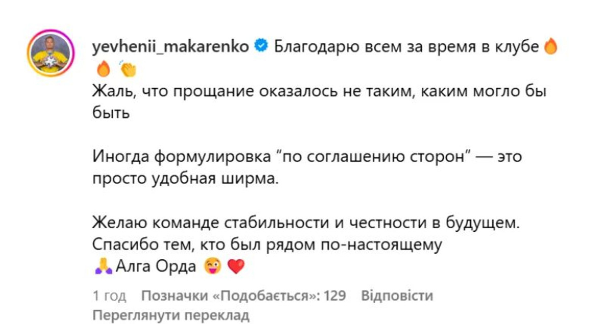 "Жаль, что прощание оказалось не таким, каким могло бы быть. Иногда формулировка "по соглашению сторон" – это просто удобная ширма. Желаю команде стабильности и честности в будущем. Спасибо", – написал 33-летний полузащитник.