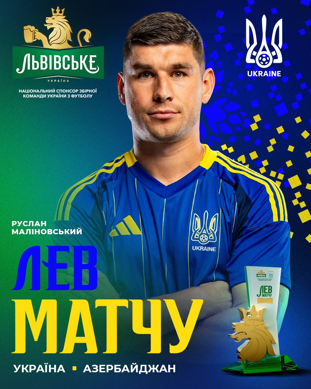 Полузащитник Руслан Малиновский стал обладателем приза "Лев Матча" в матче отбора на ЧМ-2026 с Азербайджаном (2:1).