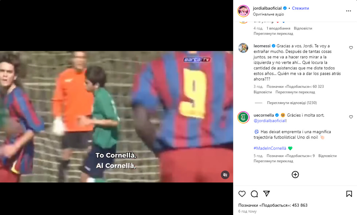 "Спасибо тебе, Жорди. Я буду очень по тебе скучать. После стольких совместных событий мне будет странно смотреть налево и не видеть тебя там... Невероятно, сколько раз ты мне помогал на протяжении всех этих лет... Кто же теперь будет мне пасовать назад????", – написал Месси.