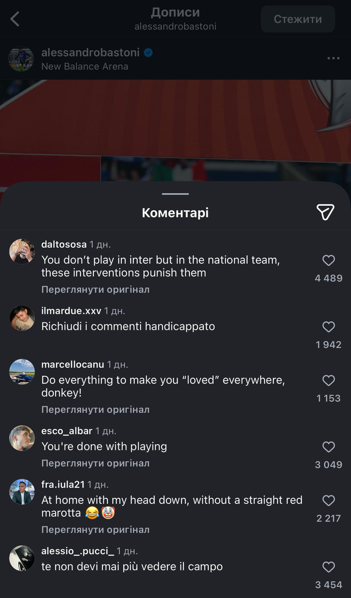 Но худшее ждало впереди. Бастони начал получать массовые оскорбительные сообщения в соцсетях. Под удар попала и его жена, которая также столкнулась с волной хейта. В результате пара решила отключить комментарии под своими публикациями, и теперь писать могут только близкие люди.