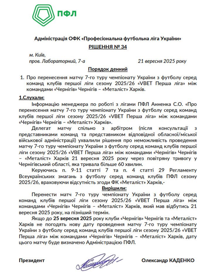 "Решено матч 7-го тура чемпионата Украины по футболу среди команд клубов первой лиги сезона 2025/26 "VBET Первая лига" между командами Чернигов – Металлист Харьков, который должен был состояться 21 сентября 2025 года, на более поздний срок.